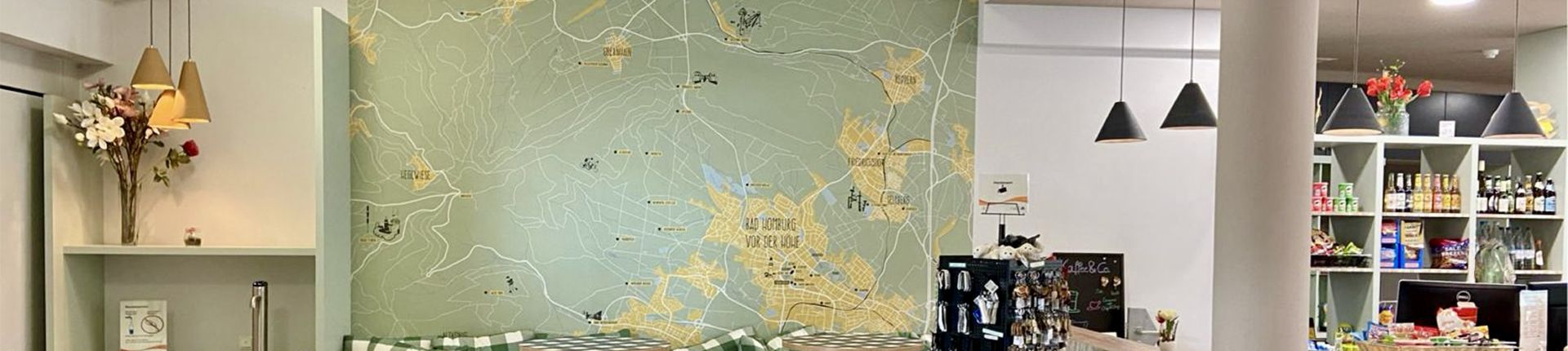 Neugestaltung des Aufenthaltsbereiches der Jugendherberge Bad Homburg. Ausführung von Bodenbelag, Trockenbau (Theke der Rezeption) und Malerarbeiten.